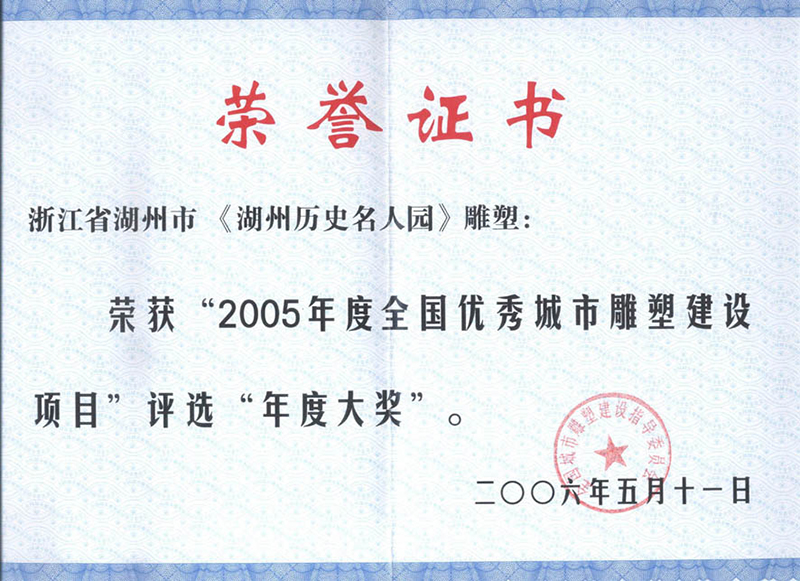 《湖州歷史名人園》獲“2005年度全國(guó)城市雕塑建設(shè)項(xiàng)目”年度大獎(jiǎng)
