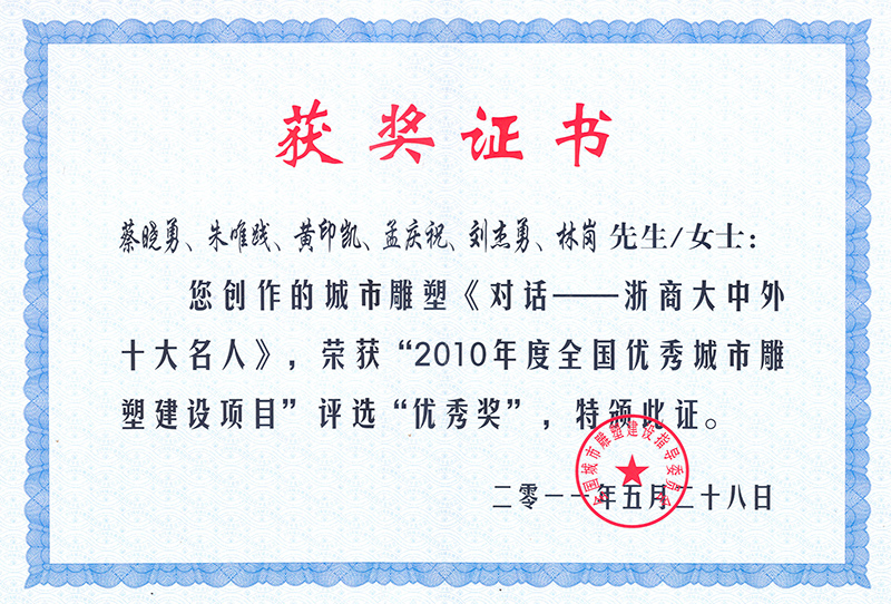對(duì)話(huà)—浙商大中外十大名人》獲“2010年度全國(guó)城市雕塑建設(shè)項(xiàng)目”優(yōu)秀作品獎(jiǎng)
