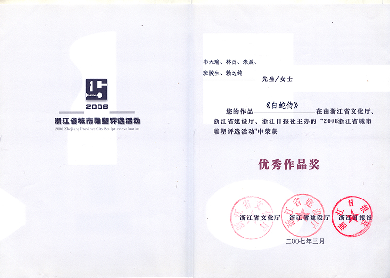 《白蛇傳》“2006年浙江省城市雕塑評(píng)選活動(dòng)”優(yōu)秀作品獎(jiǎng)
