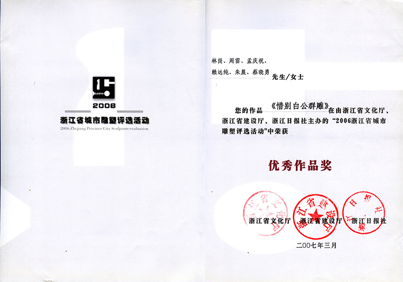 《惜別白公群雕》“2006年浙江省城市雕塑評(píng)選活動(dòng)”優(yōu)秀作品獎(jiǎng)